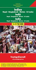 Gedetailleerde, eenzijdige landkaart van het Indiase subcontinent, prima geschikt voor planning en rondtrekken . De berijdbare wegen zijn goed weergeven, zowel de hoofdwegen als provinciale en lokale wegen; wegnummers worden vermeld. Afstanden tussen plaatsen zijn in kilometers op de kaart ingetekend, daarnaast worden ook op belangrijke plekken benzinepompen gemarkeerd.